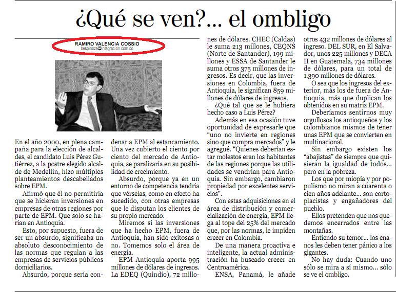 Entre políticos se entienden, y el tira y afloje se convierte en un excelente espectáculo que nosotros, los de a pie, disfrutamos a carta cabal. Para la muestra el artículo que publicó Ramiro Valencia el sábado 5 de febrero en el periódico El Colombiano con el titulo ¿QUÉ SE VEN?… EL OMBLIGO, en el cual se da con el balde y el trapeador al aspirante a la Alcaldía de Medellín, Luis Pérez Gutiérrez.
