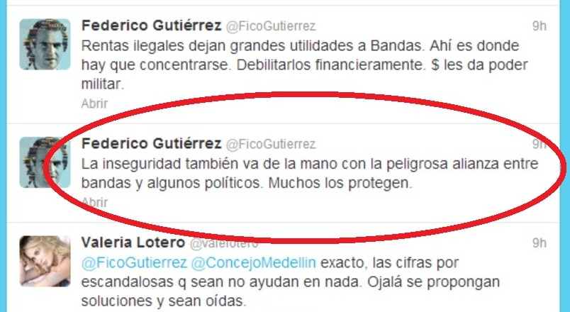“La inseguridad también va de la mano con la peligrosa alianza entre bandas y algunos políticos. Muchos los protegen”. Ese fue el trino del exconcejal y excandidato por el Partido de la U a la Alcaldía de Medellín, Federico Gutiérrez que puso a trasbocar a más de un político de la ciudad y en especial al cabildante por el Partido Verde, Jaime Roberto Cuartas Ochoa.