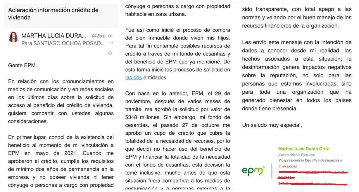 A través de un correo electrónico la funcionaria envió un mensaje de aclaración en el que explica que desistió del crédito de vivienda de EPM por haber logrado la aprobación por más dinero y para el mismo objetivo de su Fondo de Cesantías.
