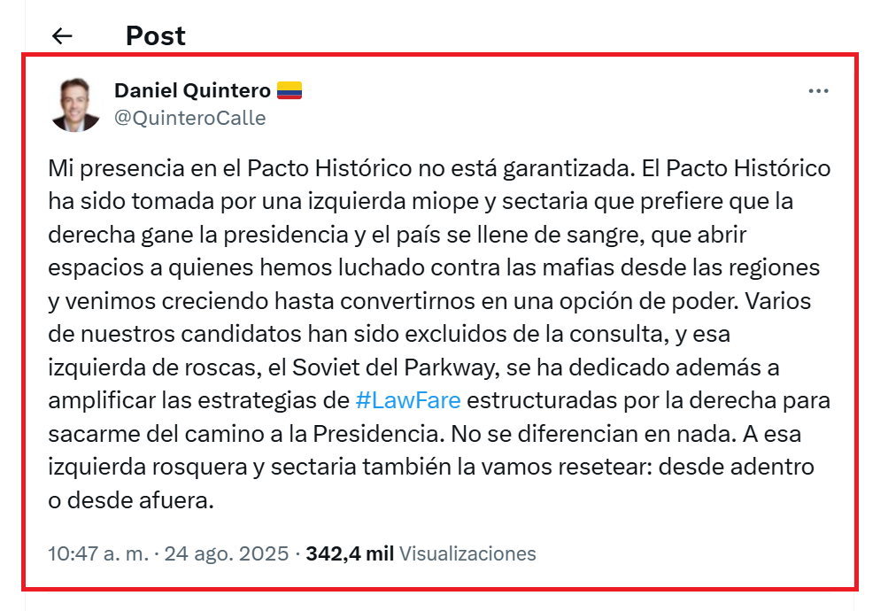 El renunciado exalcalde Quintero dejó entrever que su participación en la consulta interna del Pacto Histórico el 26 de octubre no está asegurada. Denunció sectarismo e institucionalidad debilitada en medio de pujas internas, mientras Iván Cepeda refuerza su presencia como precandidato oficial del movimiento.