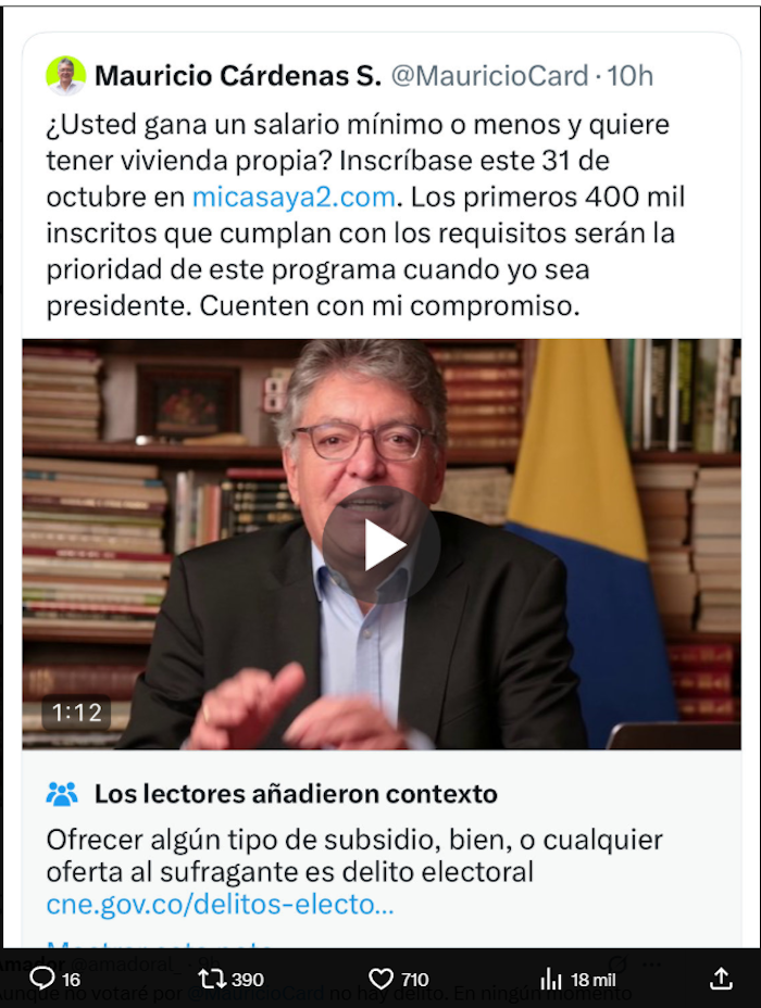 El exministro de Hacienda y aspirante a la Presidencia, Mauricio Cárdenas, publicó un video en el que ofrecía vivienda a quienes se inscribieran en “Mi Casa Ya”. La propuesta, que buscaba posicionar su programa encaja en el delito de corrupción de sufragante contemplado en el Código Penal.