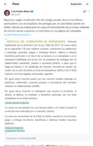“Según el Artículo 390 del Código Penal, ofrecer beneficios particulares con el propósito de sufragar por un candidato puede ser delito. Revisé las implicaciones para el ofrecimiento de priorizar vivienda de interés social a quienes se inscriban en su página de campaña”.