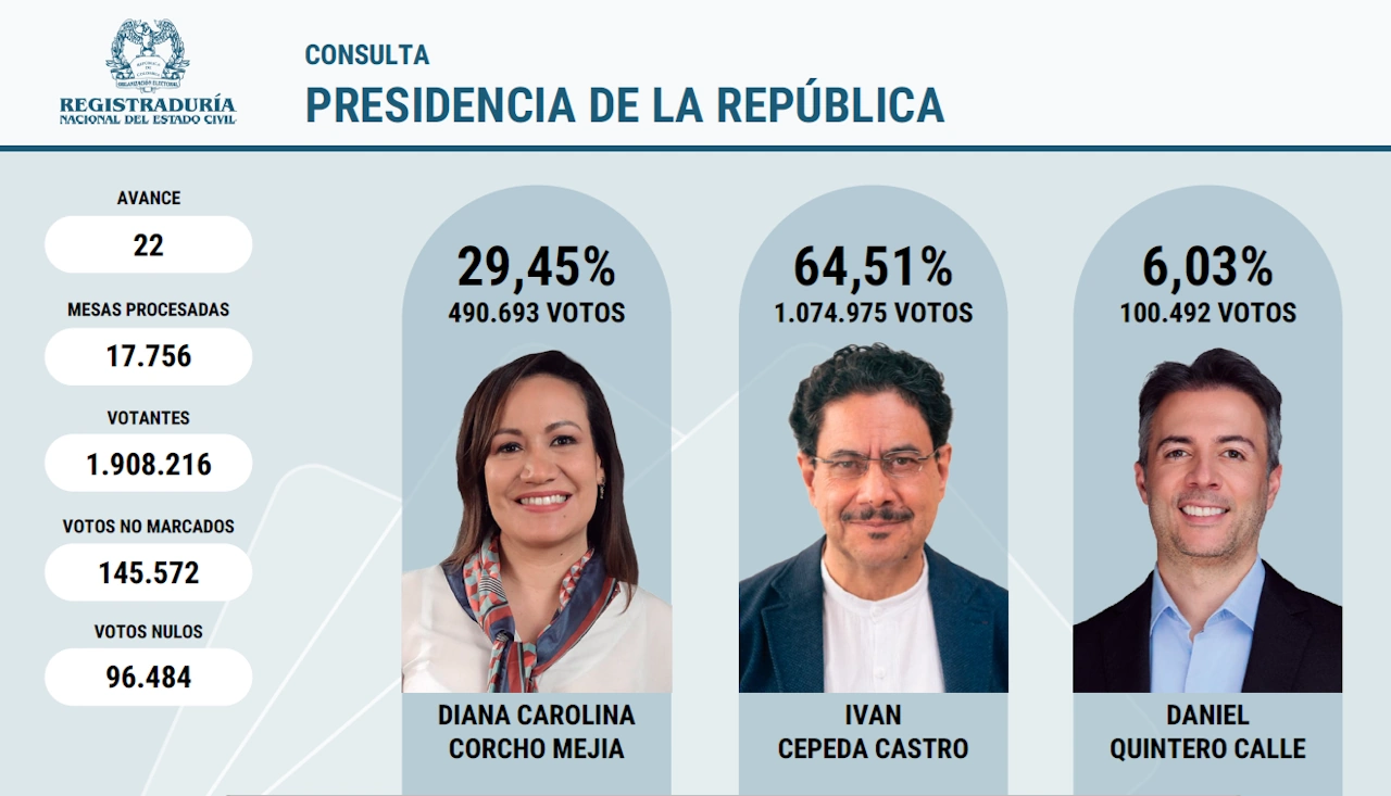 La decisión se produce un día después de realizada la consulta del Pacto Histórico en la que Quintero quedó de “primera princesa” al lograr unos modestos 145 mil votos. En esa consulta, el ganador fue Iván Cepeda con un porcentaje del 65% alrededor de 1.2 millones de votos válidos aproximadamente.