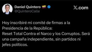 Quintero anunció que inscribirá un comité de firmas para aspirar a la Presidencia luego de haber obtenido una modesta votación durante la consulta de Pacto Histórico. Según el Registrador, las normas lo limitan para continuar participando en la jornada electoral del 2026.