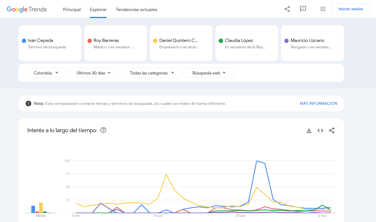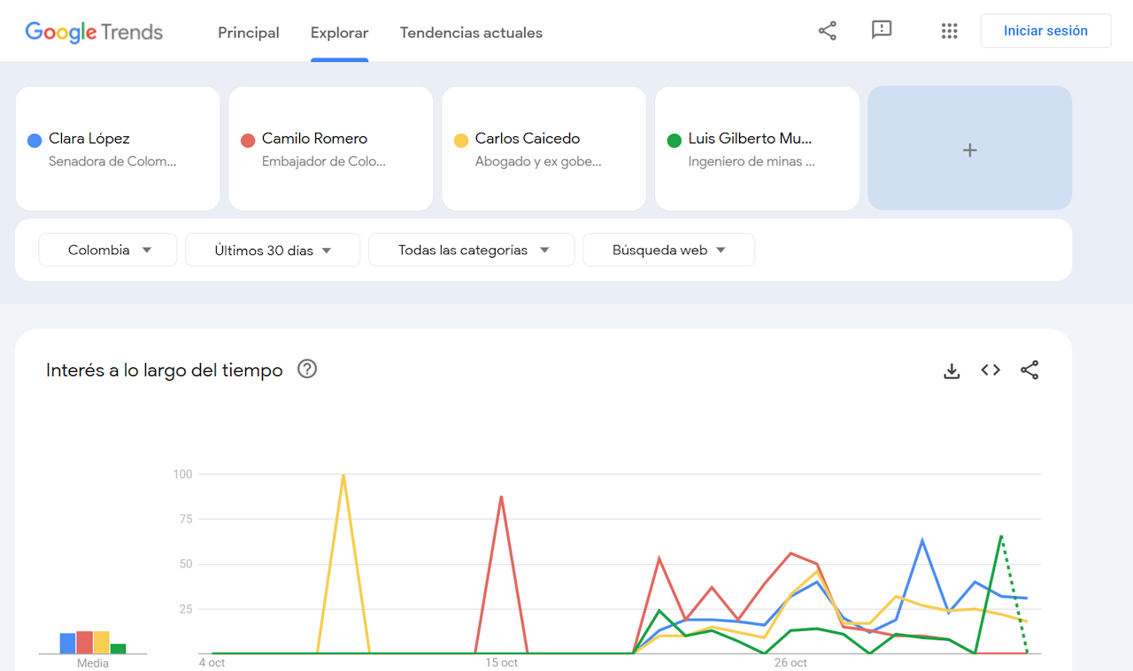 En el último mes, Camilo Romero, por ejemplo, medio logra algunos repuntes de búsqueda con alzas entre el 14 y el 28 de octubre, posiblemente impulsadas por sus críticas contra la dirigencia del Pacto Histórico.