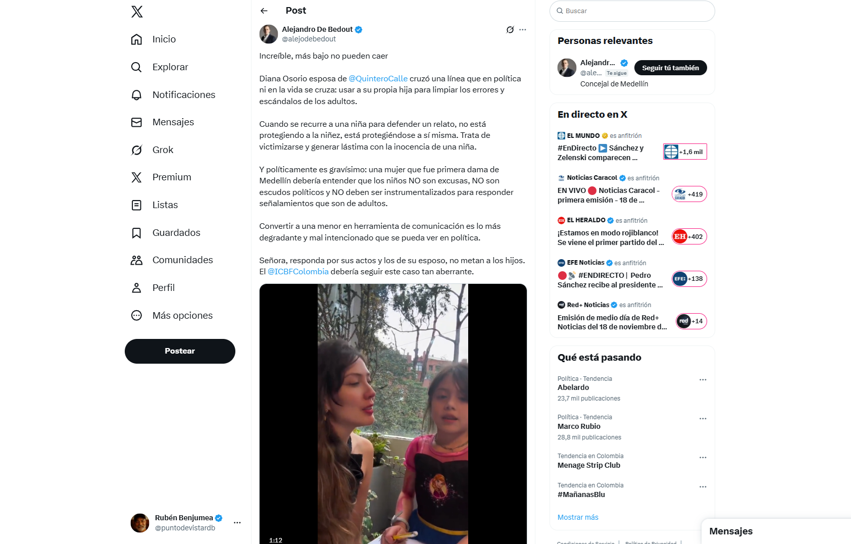 En un mensaje publicado por la red social X, el concejal de Medellín Alejandro de Bedout denunció que la exgestora social de Medellín, Diana Osorio, esposa del exalcalde Daniel Quintero, habría “convertido a una menor en herramienta de comunicación” para desmentir versiones públicas contra ella y su esposo.